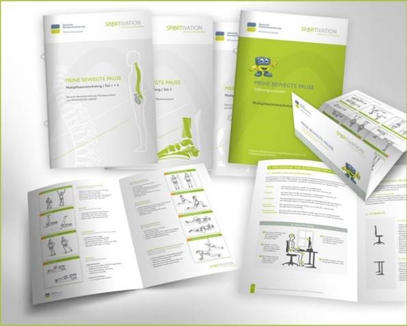 Die angefügte Abbildung zeigt individuelle Schulungsunterlagen zu den Themen Rückengesundheit, Bewegung und Arbeitsplatzergonomie, die in Zusammenarbeit mit der Deutschen Rentenversicherung Mitteldeutschland eingesetzt wurden.